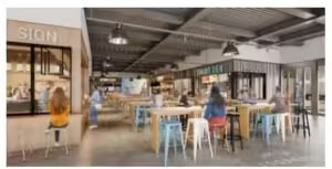 2023年7月に第1期オープンし、大阪・京橋の新たなサードプレイスを目指して、屋台や移動販売ゾーン、芝生広場&ライブステージなどを展開。今回、第2期として、新たに「フードホール」を設置し、暫定利用の特性を生かしたラフでモダンなデザインの屋内共有スペースに、うどんや中華カフェ、クラフトビールが楽しめるビアバーなど4店舗の飲食店が出店している。