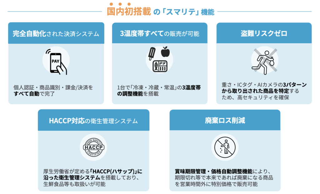 無人小売基幹システム「スマリテ」は、従来の小売業態が抱える数々の課題を解決するサービスとして、主に以下の国内初の機能を備えています。
